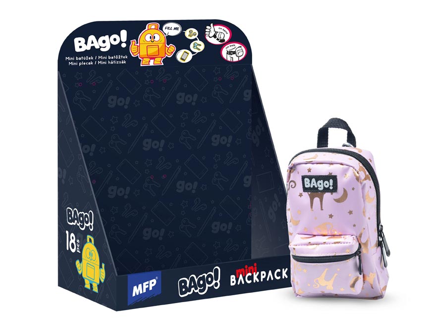 Minibatůžek Bago ve světle fialové barvě zdobený zlatým potiskem koček, měsíců a hvězd je ideální pro každou malou slečnu nebo dívku, která miluje hravé a stylové doplňky.Disponuje prostornou hlavní kapsou s dvoucestným zipem, která je ideální pro uložení drobných nezbytností, jako je mobilní telefon, peněženka nebo jiné menší předměty. Na zadní straně jsou dvě černé gumičky, které imitují ramenní popruhy a umožňují tak snadné upevnění na řidítka kola či koloběžky, nebo jednoduše na zápěstí. Batůžek je vybaven stříbrnou karabinou, díky které ho připevníte ke kalhotám, batohu nebo tašce, a může posloužit také k zavěšení klíčů či přívěsku. Tento stylový batůžek zaujme nejen svým vzhledem, ale i praktičností.