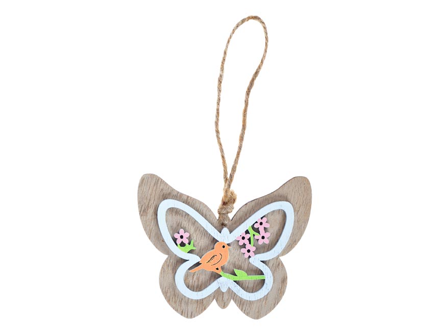 Velikonoční dřevěná dekorace 3D motýlek se závěsem. Vyzdobte si byt velikonočními dekoracemi a přivítejte tak svátky jara. Tuto dekoraci můžete použít na dekorování velikonočních věnců nebo větviček. Dekorace obsahuje výřez s dalšími velikonočními motivy. Dekorace má provázek na zavěšení.