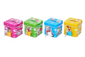 Plechová uzamykatelná pokladnička ve tvaru čtverce s motivy zvířat. Dodáváme v mixu 4 ks dle skladové záasoby Uvedená cena je za 1 ks.
