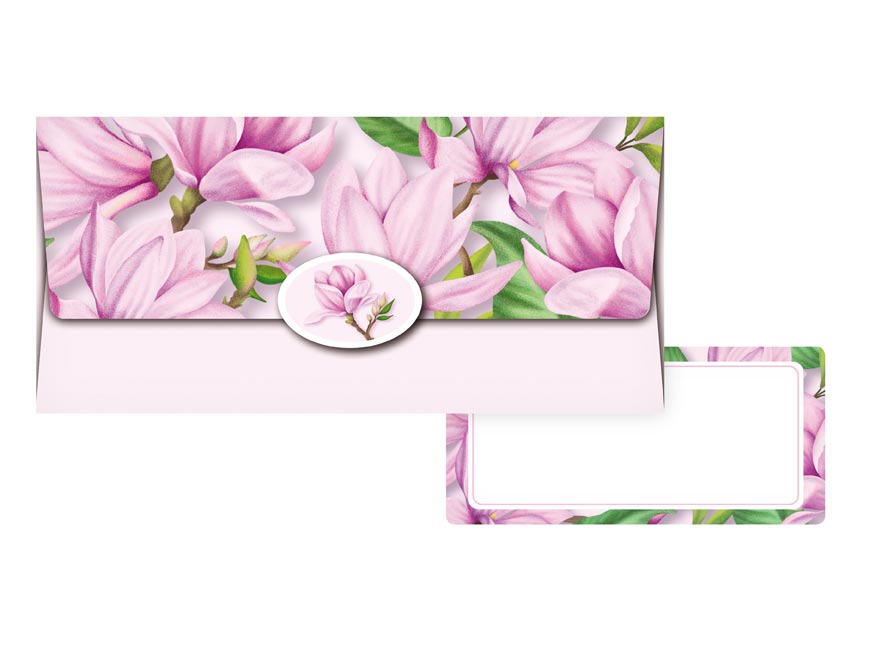 Obálka na peníze s romantickým motivem květů magnólie v jemné růžové barvě je ideální volbou pro darování finančního obnosu na zvláštní příležitosti, jako jsou svatby, narozeniny nebo výročí. Obálka obsahuje kartičku pro případný vzkaz, přání či osobní věnování, čímž dodá vašemu daru osobní nádech. Uzávěr na přední straně spolehlivě zajistí, že obsah zůstane bezpečně uložen.