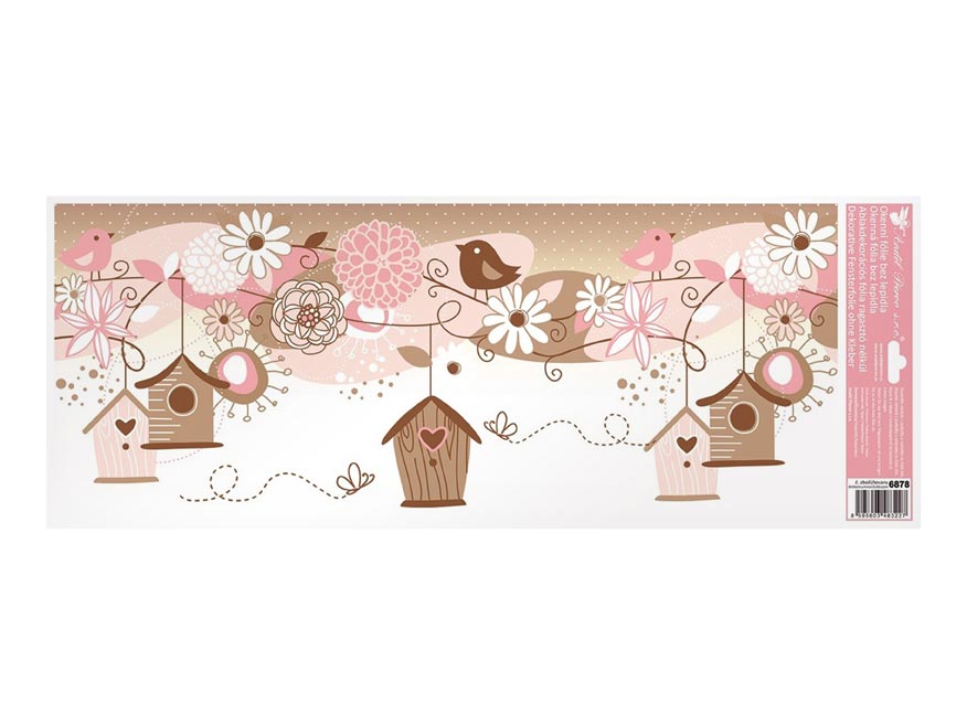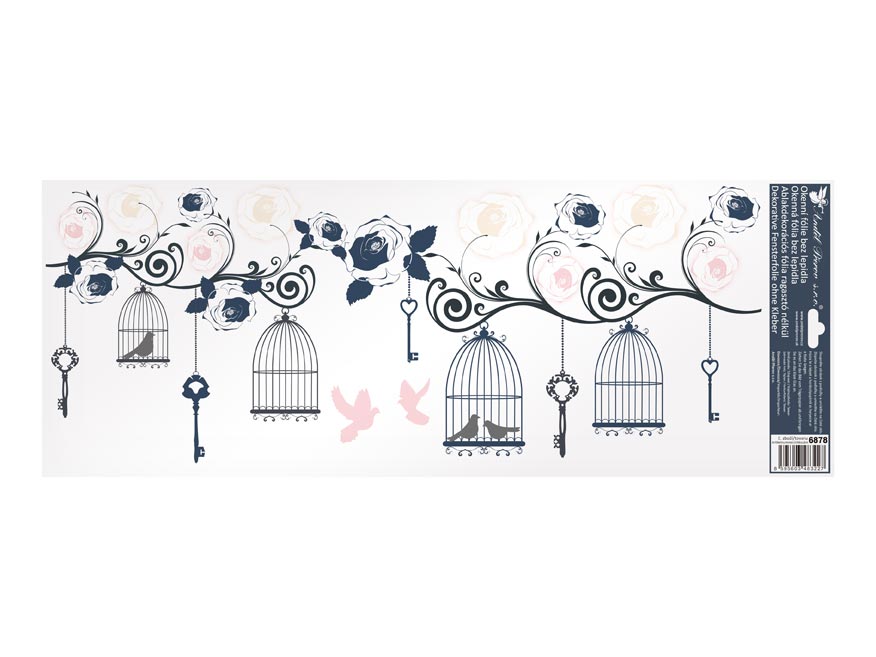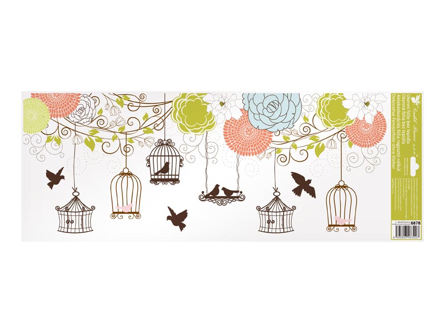 Dekorační okenní fólie – ptáčci. Okenní fólie neobsahují lepidlo. Na plochu přilnou elektrostaticky a nezanechávají tedy po sobě žádnou stopu. Vhodné jsou jakékoli hladké plochy, například sklo, výlohy, zrcadla nebo kachličky. Čisté – bez lepidla – opakovaně použitelné.