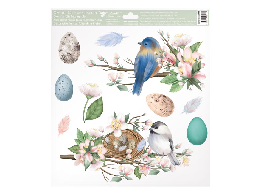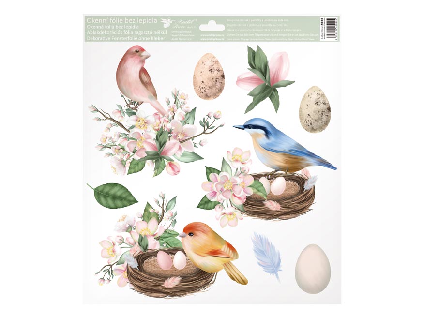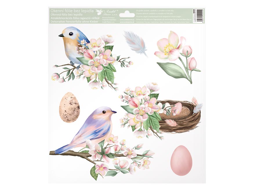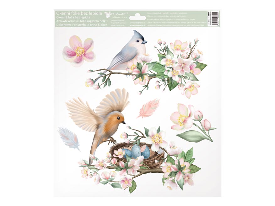Dekorační okenní fólie – ptáčci s glitry. Krásné okenní fólie s obrázky různobarevných ptáčků na rozkvetlých větvích s třpytkami. Na plochu přilnou elektrostaticky a nezanechávají tedy po sobě žádnou stopu. Vhodné jsou jakékoli hladké plochy, například sklo, výlohy, zrcadla nebo kachličky. Čisté – bez lepidla – opakovaně použitelné.