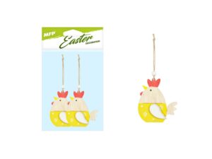 Krásná velikonoční dekorace v designu dřevěné žluté slepičky se závěsem, poslouží jako dekorace do exteriéru nebo na zkrášlení interiéru. Dekorace má provázek na zavěšení. Balení obsahuje: - 2 ks dekorací (slepice) Velikost: 90 mm Dodáváme v sáčku se závěsem. Uvedená cena je za 1 balení.
