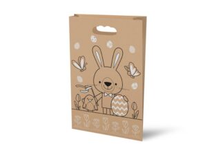 Velikonoční papírová taška s potiskem zajíčka, kuřete a kraslice. Ideální pro vytváření čokoládových balíčků pro děti! Materiál: hnědý papír 85 g Rozměr: 260 x 410 x 110 mm Uvedená cena je za 1 ks.