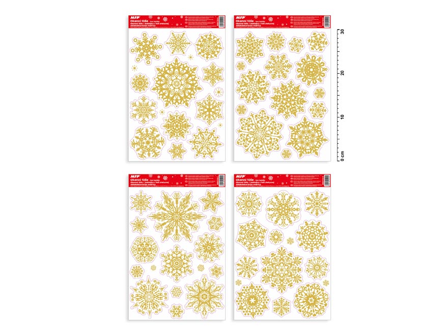 Vánoční okenní fólie s motivem zlatých vloček. Vyzdobte si okno těmito krásnými samolepkami. Vytvoří Vám kouzelnou vánoční atmosféru u Vás doma. Vhodné jsou na jakékoli hladké plochy, například sklo, výlohy, zrcadla nebo kachličky. Čisté, bez lepidla a opakovaně použitelné.