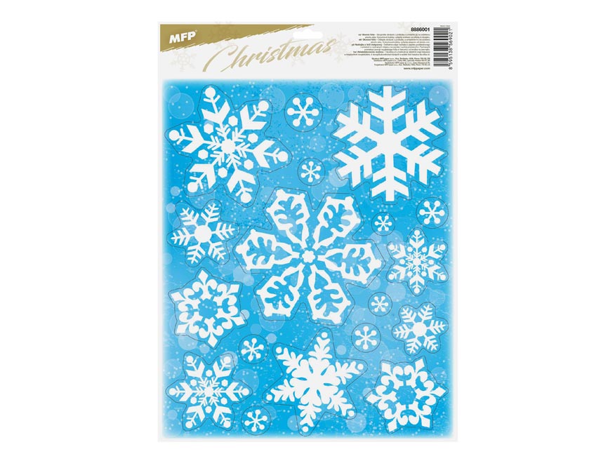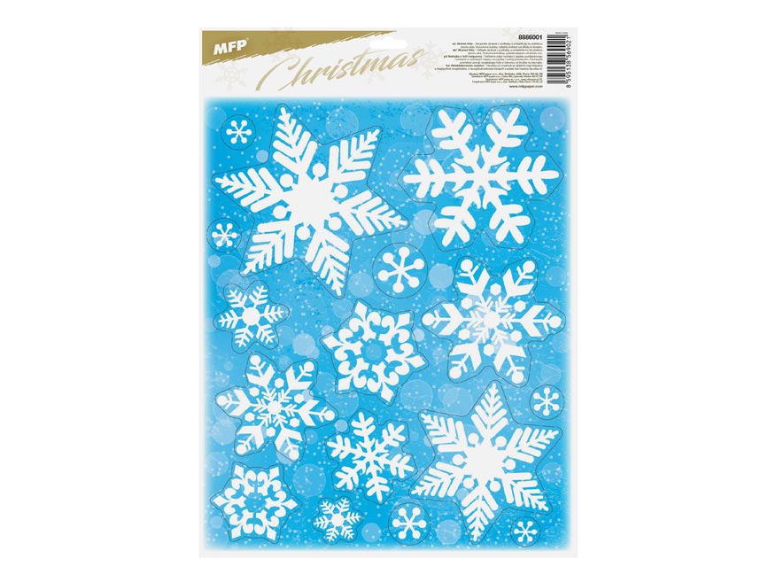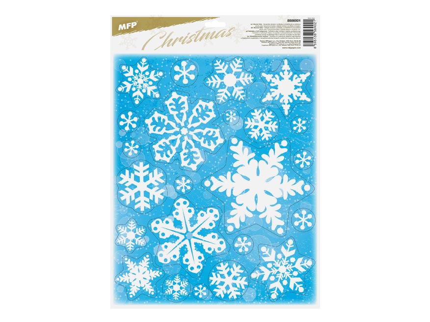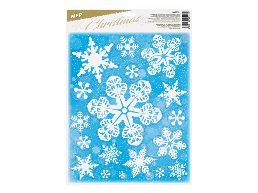 Vánoční okenní fólie glitrová s motivem sněhových vloček. Pomocí okenních fólií si velmi snadno a rychle vytvoříte vánoční atmosféru na celé svátky. Fólie se lehce odlepují a nalepují a nezanechávají za sebou žádné stopy lepidla.
