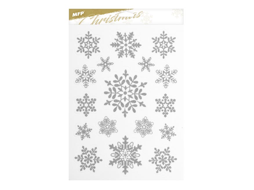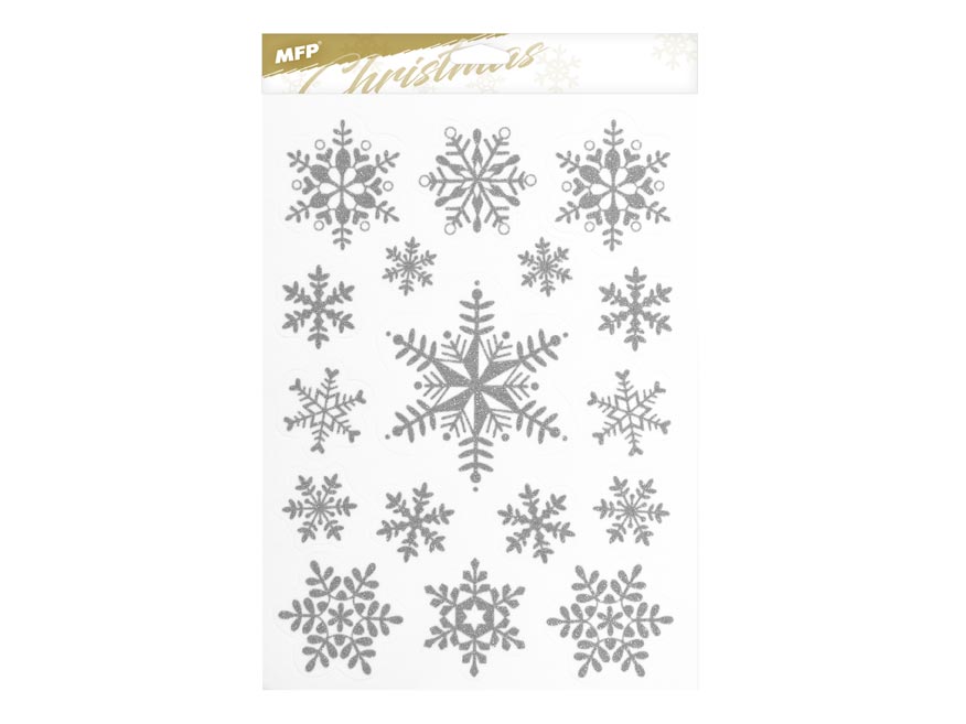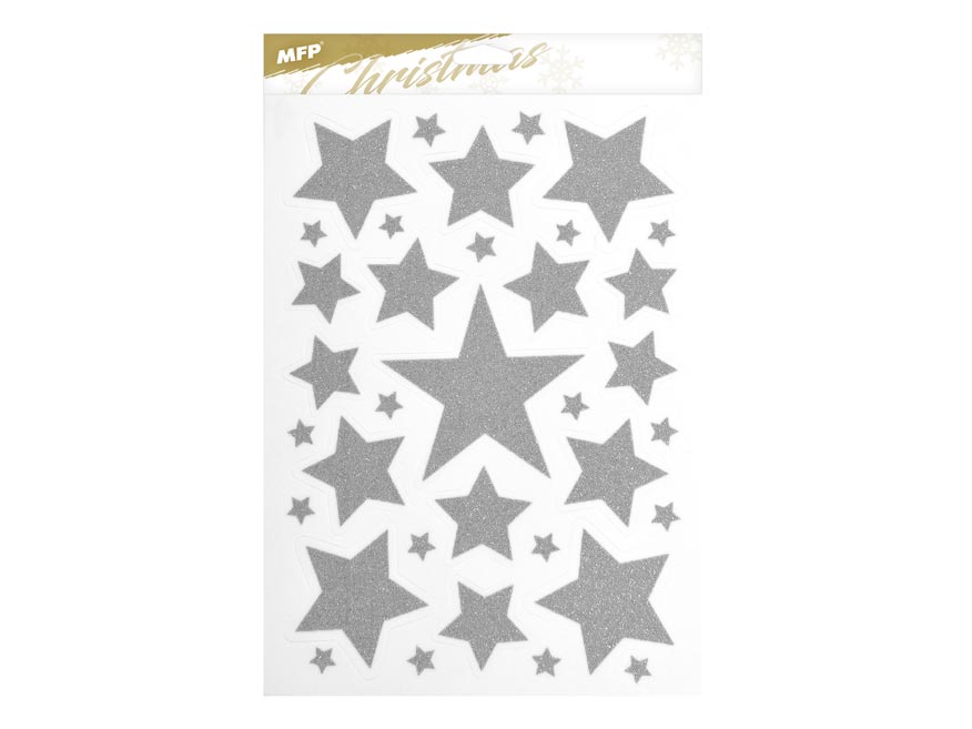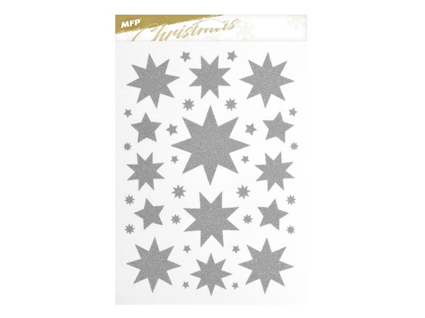 Vánoční okenní fólie glitrová s motivy stříbrných hvězd a vloček. Pomocí okenních fólií si velmi snadno a rychle vytvoříte vánoční atmosféru na celé svátky. Fólie se lehce odlepují a nalepují a nezanechávají za sebou žádné stopy lepidla.