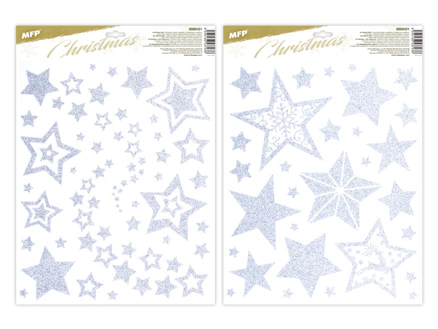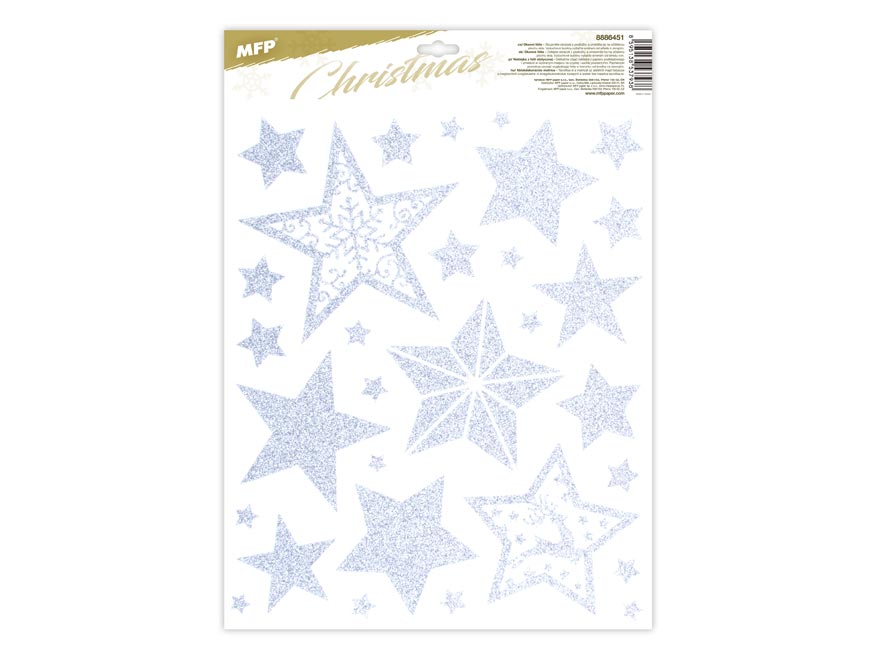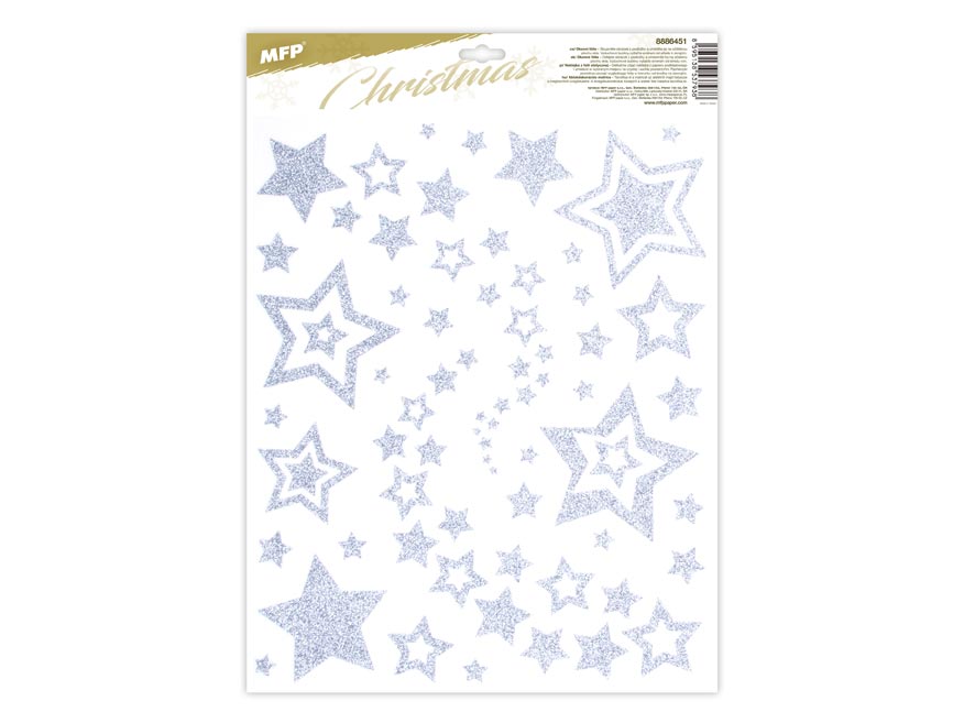Vánoční okenní fólie s motivem stříbrných hvězd s glitry. Pomocí okenních fólií si velmi snadno a rychle vytvoříte vánoční atmosféru na celé svátky. Fólie neobsahuje lepidlo, jednoduše elektrostaticky přilne na čistém okně, zrcadle apod.