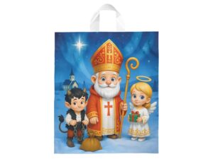 Igelitová taška s průhmatem v Mikulášském motivu, která je ideální na zabalení dobrot, sladkostí a na další mikulášskou nadílku pro děti. Na tašce je obrázek Mikuláše, anděla, čerta a vánočních dárků. Materiál: PE Rozměr: 200 x 300 x 80 mm Praktické balení: odtrhávací blok Uvedená cena je za 1 ks.