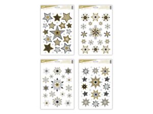 Vánoční okenní fólie s motivy sněhových vloček a hvězd s glitrem. Vyzdobte si okno těmito krásnými samolepkami. Vytvoří Vám kouzelnou vánoční atmosféru u Vás doma. Jsou vhodné na jakékoli hladké plochy, například sklo, výlohy, zrcadla nebo kachličky. Čisté, bez lepidla a opakovaně použitelné. NÁVOD: 1. Sloupněte z podložky obrázek a umístěte na čisté, případně navlhčené sklo stranou, která byla na podložce. 2. Obrázek elektrostaticky přilne. 3. Folie se snadno sloupne a dá se přemístit. Dodáváme v mixu po 4 ks dle skladové zásoby. Uvedená cena je za 1 ks.