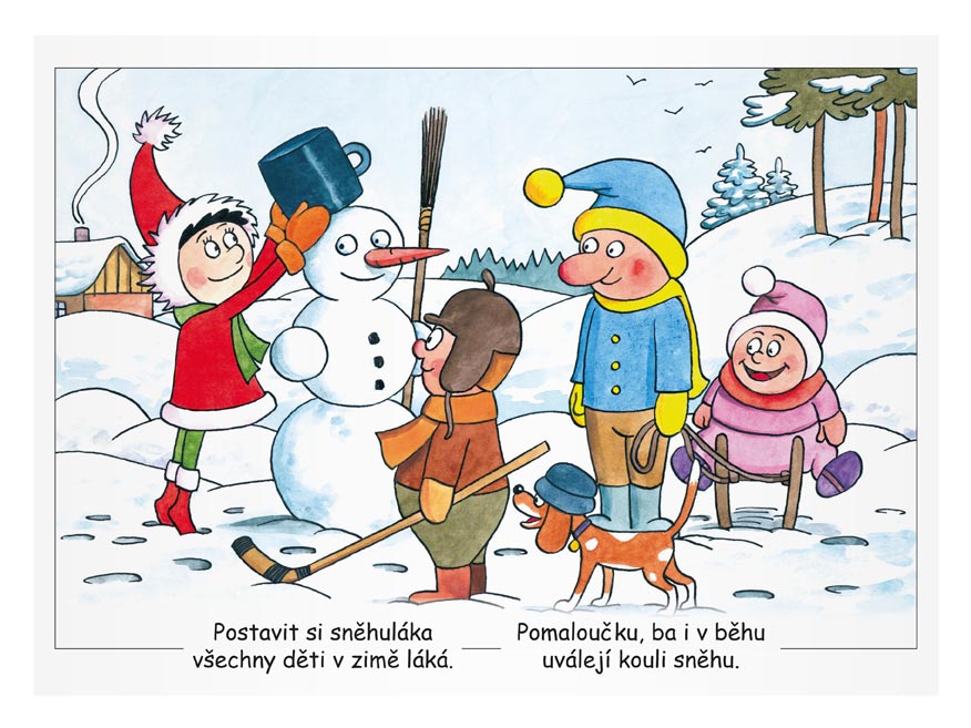 Počet obrázků: 8 (zpívání koled, stavění sněhuláka, sáňkování aj.) – U každého obrázku je Vánoční básnička.