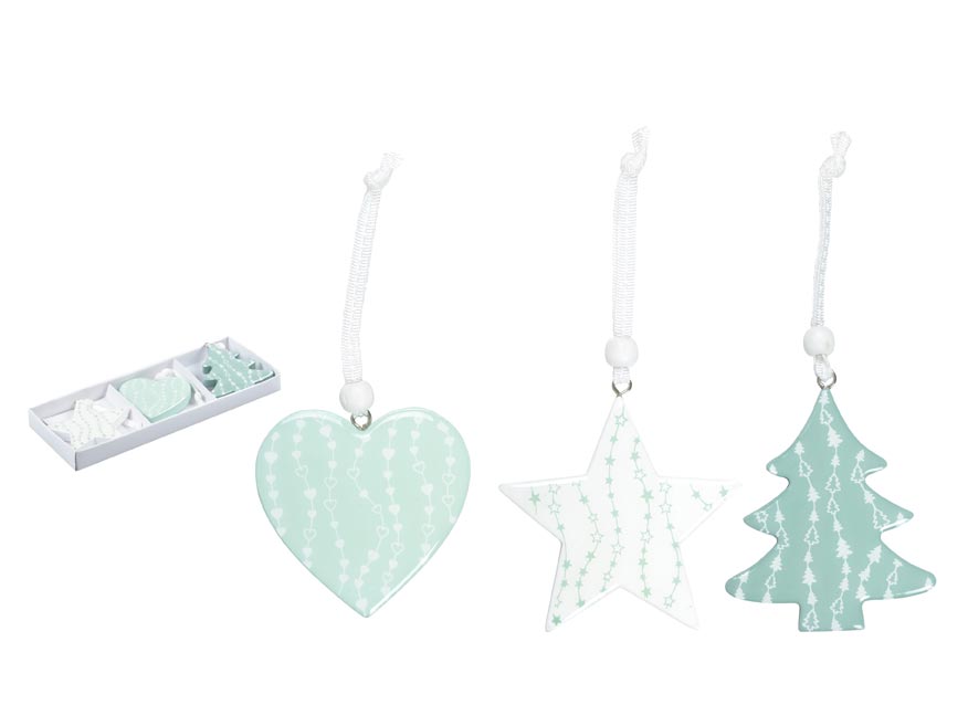 Vánoční ozdoby set 3 ks – srdíčko, stromeček a hvězda se závěsem. V horní části je očko s provázkem a korálkem, který umožňuje snadné zavěšení. Ozdobu můžete zavěsit na dveře, okno, nebo jinak zkrášlit Vaše bydlení.