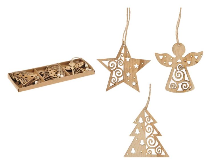 – 9 ks dřevěných ozdob (hvězda, anděl, stromeček)