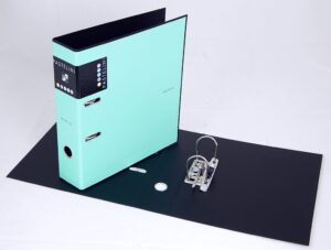 štítek na hřbetu, páková mechanika, prstokroužek, radokroužek, kovová lišta, černý hřbet