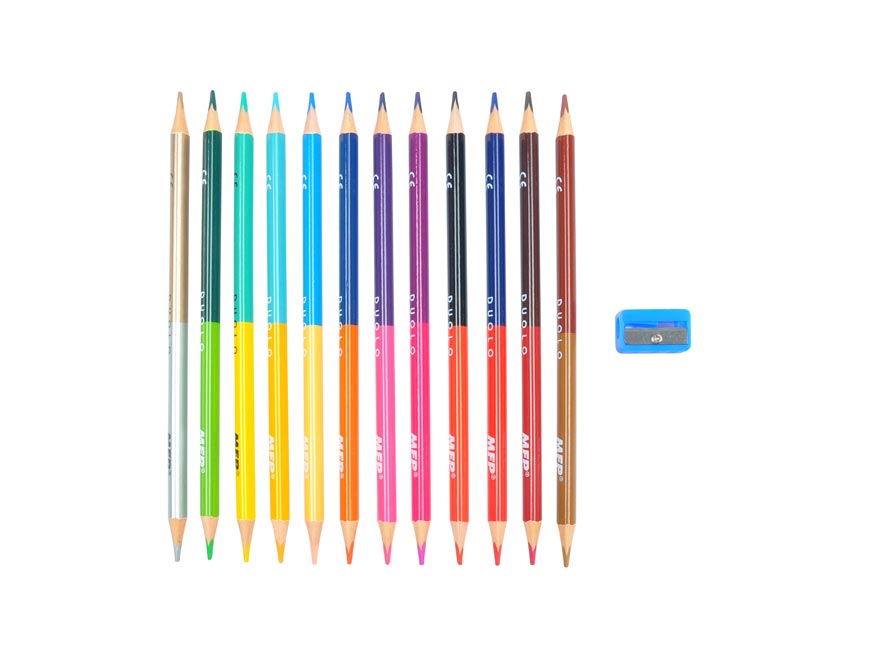 – 12 ks oboustranných pastelek, tedy 24 barev celkem ( 3x odstíny zelené, 3x odstíny hnědé, 3x odstíny oranžové, 2x odstíny červené, 2x odstíny žluté, 3x odstíny modré, zlatá, stříbrná, černá, růžová, 3x odstíny fialové)