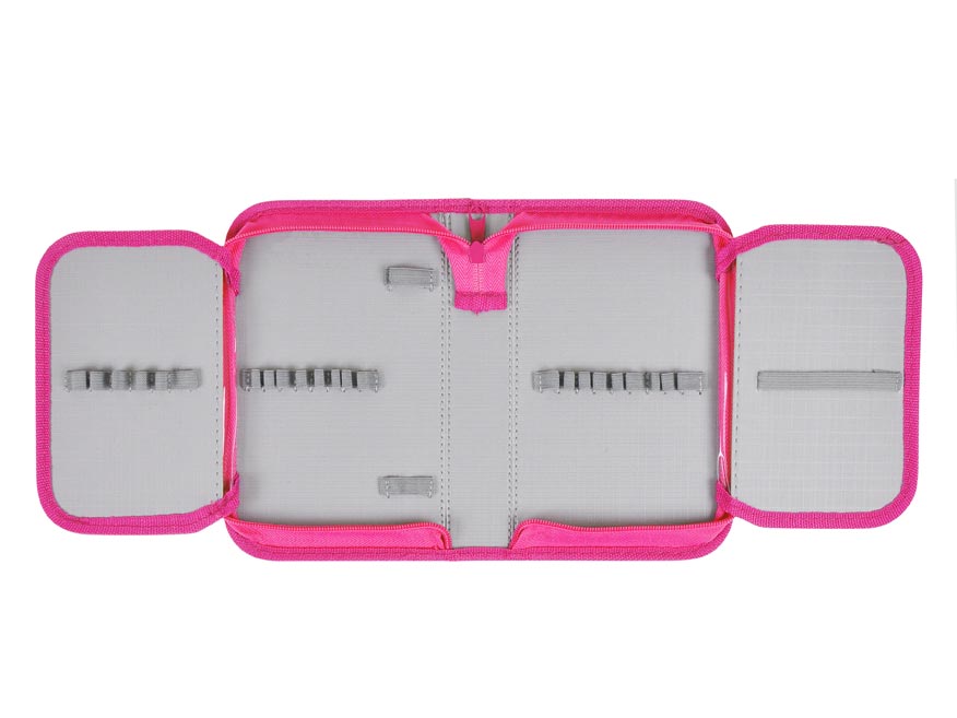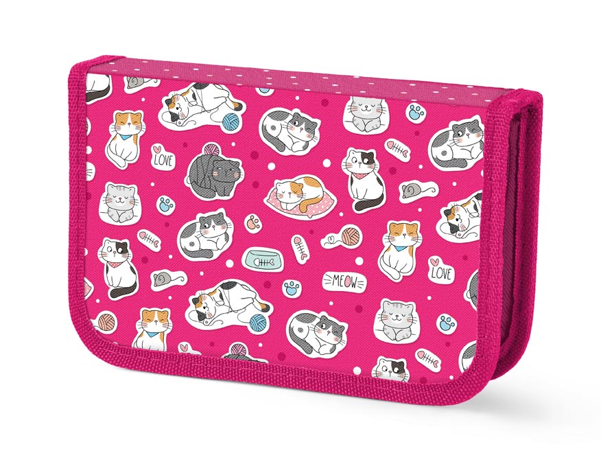Školní jednopatrový nevybavený penál se dvěma chlopněmi v sytě růžové barvě s motivem koček. Chlopně mají na vnější straně praktickou průhlednou kapsičku na rozvrh. Penál obsahuje 23 poutek na pastelky, tužky a pera a 3 větší poutka např. na nůžky, gumu, ořezávátko nebo pravítko. Velice lehce se uzavírá díky velkému zipu. Bezesporu je nezbytnou součástí vybavení každého školáka.