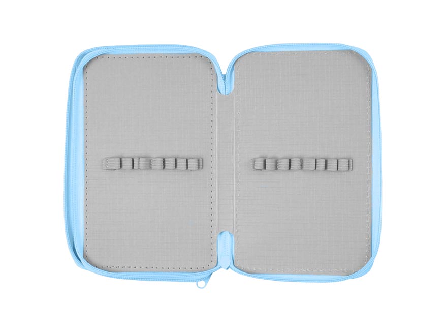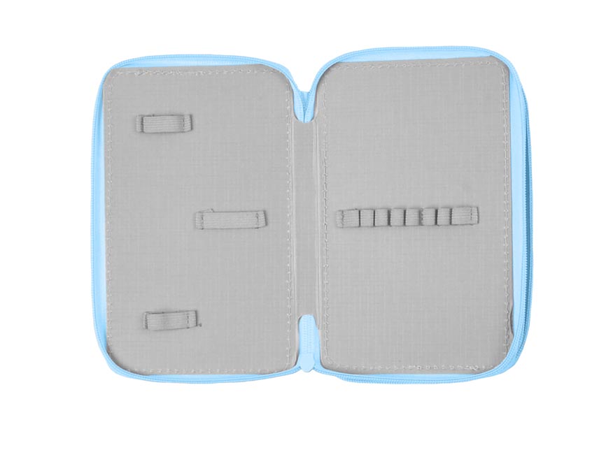 Uvnitř tohoto dvoupatrového penálu najdete důmyslně uspořádaný prostor, který je navržen tak, aby všechny psací potřeby měly své místo. Elastická poutka spolehlivě drží pastelky, fixy i pera, zatímco větší poutka jsou ideální pro drobnosti, jako je pravítko, ořezávátko nebo guma.
