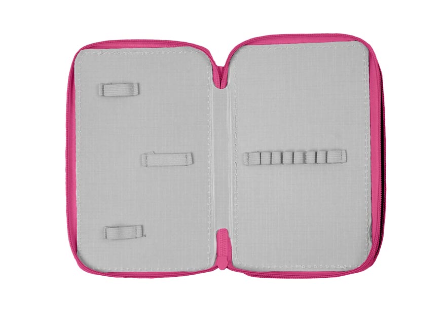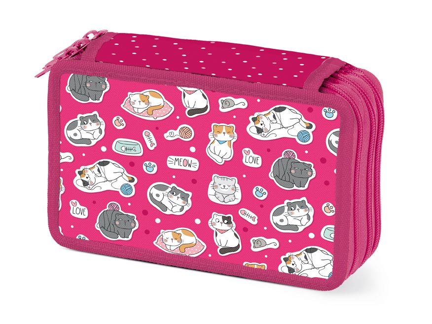 Školní třípatrový nevybavený penál v sytě růžové barvě s motivem koček. Díky třem patrům v něm uložíte naprosto všechny psací potřeby a pomůcky jako je pravítko, guma, ořezávátko, kružítko aj. Jedno patro disponuje průhlednou přihrádkou na rozvrh. Velice lehce se uzavírá díky velkému zipu a je z kvalitních a odolných materiálů. Bezesporu je nezbytnou součástí vybavení každého školáka.