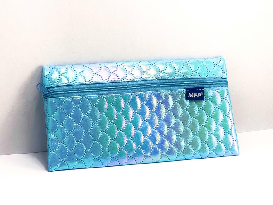 Školní penál/etue ve světle modré barvě s duhovými odlesky. Penál je plochý, s obdélníkovým tvarem, a je vybaven světle modrým zipem po celé délce, což usnadňuje přístup k uloženým věcem. Povrch penálu je prošívaný se vzorem šupin, které vytvářejí zajímavý vzhled. Penál je dostatečně prostorný, aby se do něj vešly psací potřeby, a díky svému kompaktnímu plochému tvaru se snadno vejde do batohu, kabelky nebo tašky.