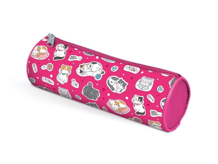 Školní penál/etue v sytě růžové barvě s motivem koček. Penál má jednu komoru s uzavíráním na zip. Uvnitř je dostatek prostoru na všechny psací potřeby, co školák potřebuje. Vhodný především na pastelky, fixy a další psací potřeby. Etue je vyrobena z kvalitních a odolných materiálů.
