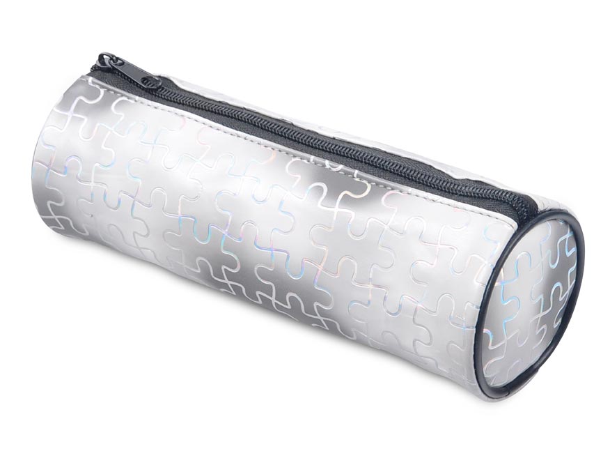 školní penál/etue válcového tvaru v bílé barvě s černými okraji a zipem, přičemž povrch působí dojmem jemně batikovaného vzoru, který je doplněn stříbrnými holografickými dílky puzzle. Tento unikátní design dodává penálu moderní a stylový vzhled, který zaujme a zároveň poskytne praktický prostor pro uschování vašich psacích potřeb.