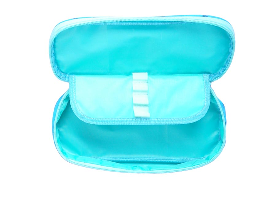 Školní penál s klopou v tyrkysové barvě s názvy měst. Je vhodným doplňkem pro studenty a větší školáky. Uvnitř je dostatek prostoru pro uložení všech psacích potřeb. Velice lehce se uzavírá díky velkému zipu.