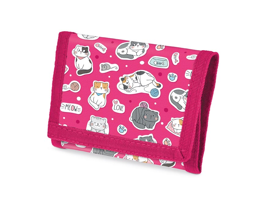 Dětská textilní peněženka v růžové barvě s motivem koček a zapínáním na suchý zip. Peněženka má přihrádku na bankovky, mince, kapsičku vhodnou například na jízdenky a také kapsičku s průhledným okýnkem o velikosti kreditní karty.