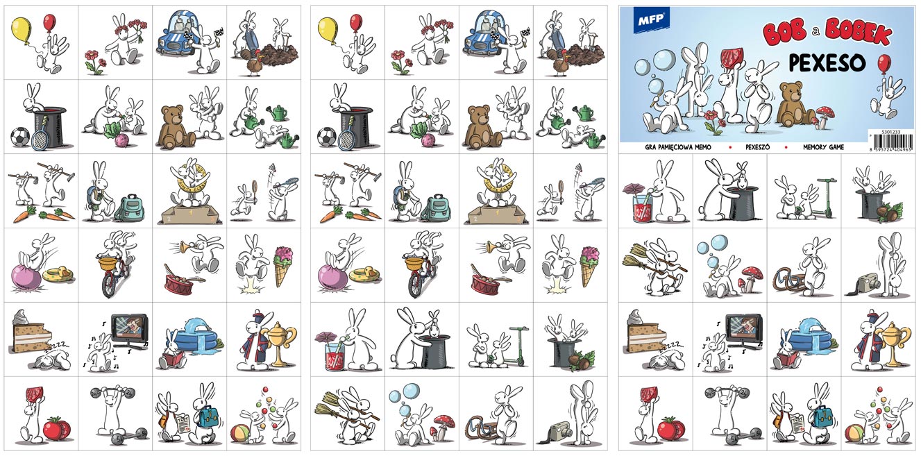 Pexeso s motivy postaviček Boba a Bobka, populárních králíků z českého animovaného seriálu. Pexeso je tradiční stolní hra, která slouží k procvičování paměti a soustředění. Hra rozvíjí schopnost zapamatovat si, kde se jednotlivé obrázky nacházejí, a podporuje tak kognitivní dovednosti, především paměť a koncentraci. Pexeso je oblíbené mezi dětmi, ale také dospělými, protože je zábavné a jednoduché na pochopení.