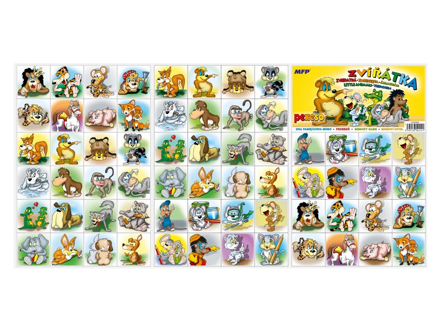 Pexeso se skládá ze tří A4, na kterých najdete 64 kartiček malovaných zvířat a návod ke hře.