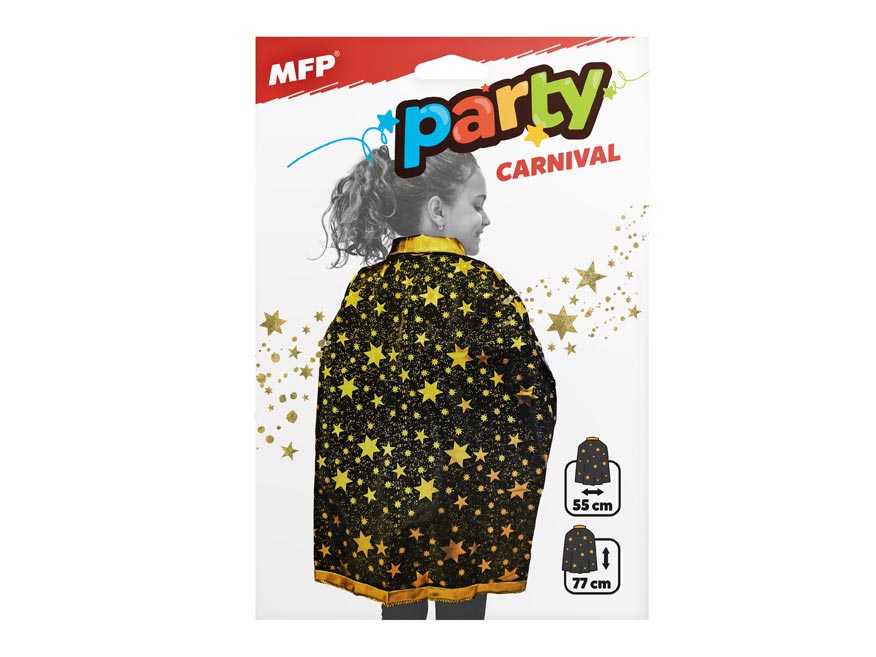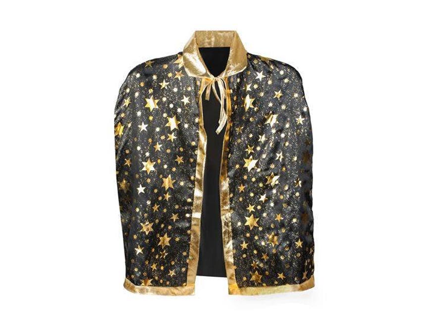Čarodějnický plášť se zlatými hvězdami. Karnevalový plášť využijete ke kostýmu černokněžníka, kouzelníka. V černozlaté kombinaci barev budete nepřehlédnutelní. Je z lehké látky a váže se pomocí šňůrek.