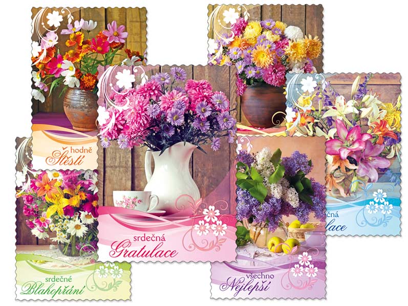 Srdečné glitrované pohlednice s výsekem. S textem jsou 4 pohledy z 6. Texty na přední straně pohlednic, Srdečná gratulace, Všechno nejlepší, Srdečné blahopřání, Hodně štěstí.