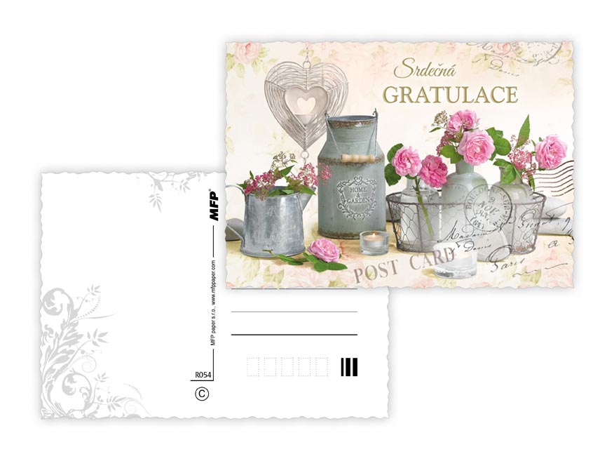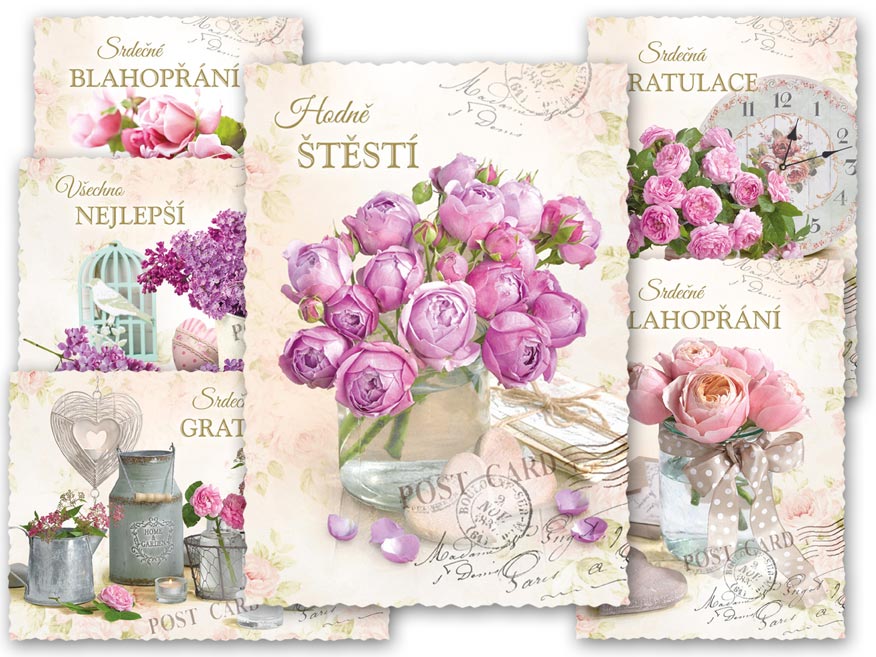 Srdečné glitrované pohlednice s výsekem. S textem jsou 4 pohledy z 6. Texty na přední straně pohlednic, Srdečná gratulace, Všechno nejlepší, Srdečné blahopřání, Hodně štěstí. Text na přední straně: Hodně štěstí, Srdečné blahopřání, Srdečná gratulace, Všechno nejlepší Text na zadní straně: Pohlednice 1: Hodně štěstí, zdraví a radosti přeje Pohlednice 2: Všechno nejlepší, hodně zdraví, štěstí a spokojenosti ze srdce přeje Pohlednice 3: Všechno nejlepší a mnoho krásných dní přeje Pohlednice 4: Všechno nejlepší, hodně zdraví, štěstí, lásky a spokojenosti přeje Pohlednice 5,6 bez textu Text: 4/6 Papír: pohlednicový karton 240 g Povrchová úprava: UV lak, výsek, glitter Dodáváme v mixu po 6 ks dle skladové zásoby. Uvedená cena je za 1 ks.