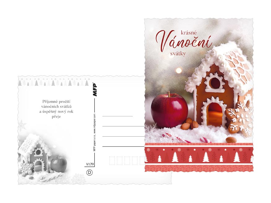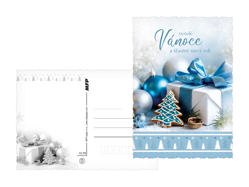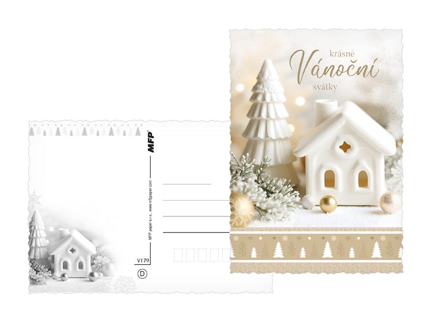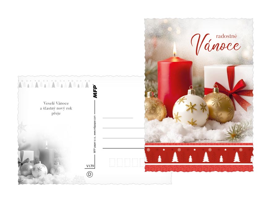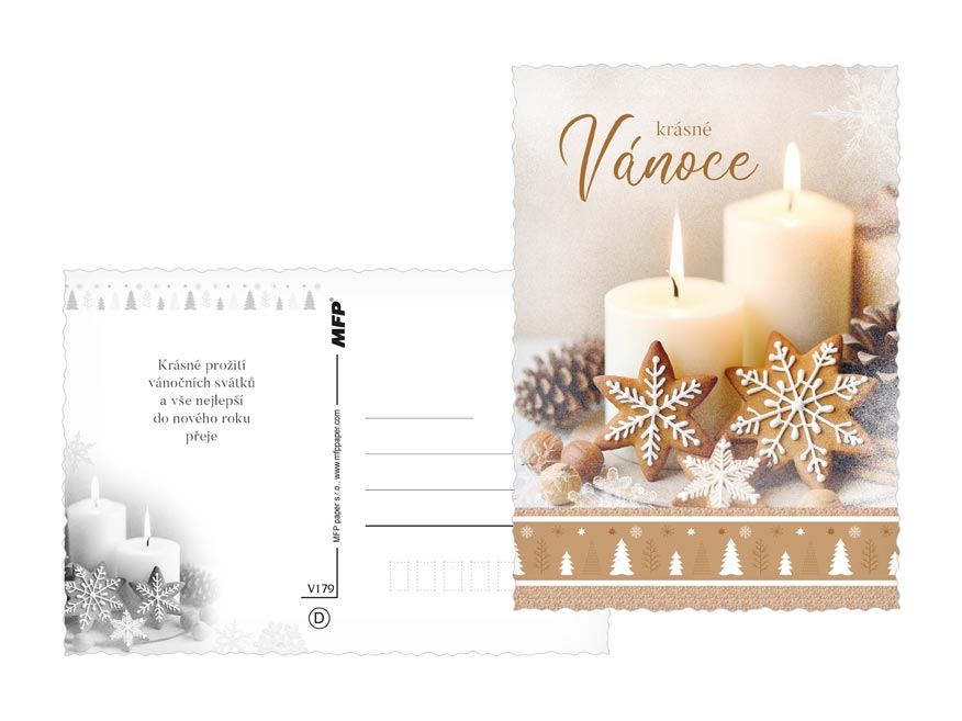 Krásná vánoční pohlednice, která potěší na první pohled. Veselé motivy svíček, perníčků, stromečků a zimních dekorací zachycují kouzlo Vánoc a vykouzlí úsměv každému, kdo ji najde ve schránce. Jemné detaily a elegantní provedení dodávají pohlednici sváteční nádech. Skvělý způsob, jak popřát krásné Vánoce a přenést trochu sváteční radosti k těm, na kterých vám záleží. Text na zadní straně obsahují 3 pohlednice z 6.