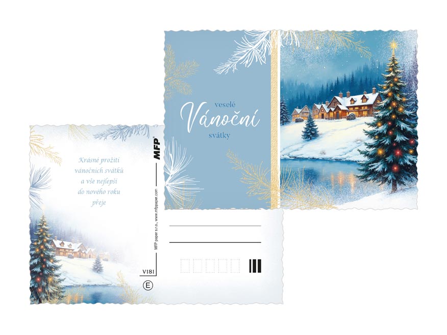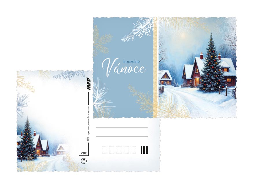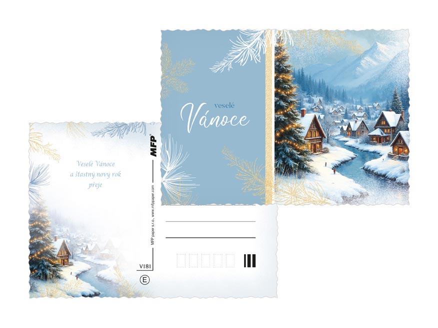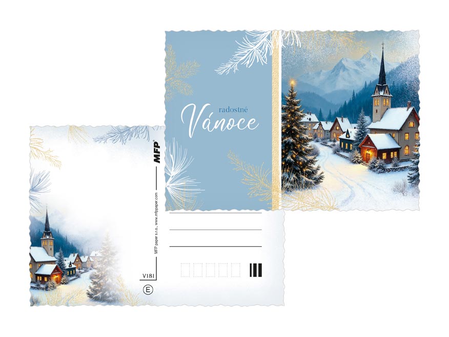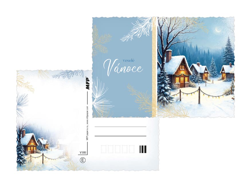 Vánoční pohlednice s motivy zasněžených chaloupek, kostelíků a horských vesniček přenesou příjemce do pohádkového zimního světa. Něžné ilustrace, jemný třpyt a pečlivě propracované detaily dodávají každému přání výjimečný šarm. Perfektní volba, když chcete popřát krásné a klidné Vánoce s elegancí a srdcem. Text na zadní straně obsahují 3 pohlednice z 6.