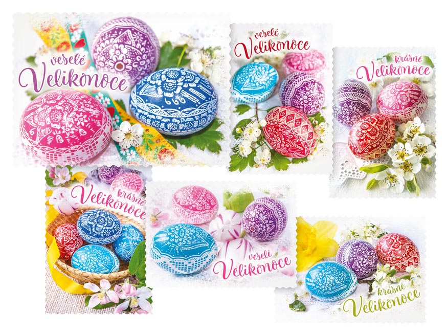 Pohlednice s velikonočním motivem. Text na zadní straně obsahují 4 pohlednice z 6.