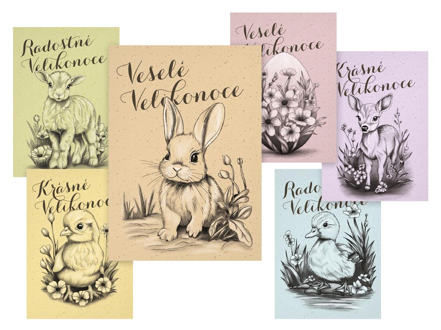 Oživte velikonoční svátky těmito nádhernými pohlednicemi, které zaujmou svými ručně kreslenými ilustracemi plnými něžných detailů. Zajíčci, kuřátka, srnky a velikonoční vajíčka v květinovém aranžmá.
