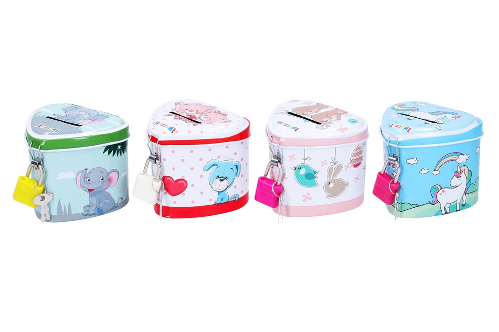 Plechová uzamykatelná pokladnička ve tvaru srdce, s motivy zvířat.