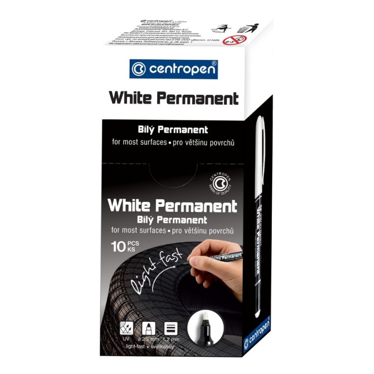 10/ univerzální bílý značkovač, píše na většinu povrchů, po zaschnutí odolá za sucha otěru, na porézních površích permanentní, světlostálý, vodní báze, válcový hrot, šířka stopy 1,2 mm
