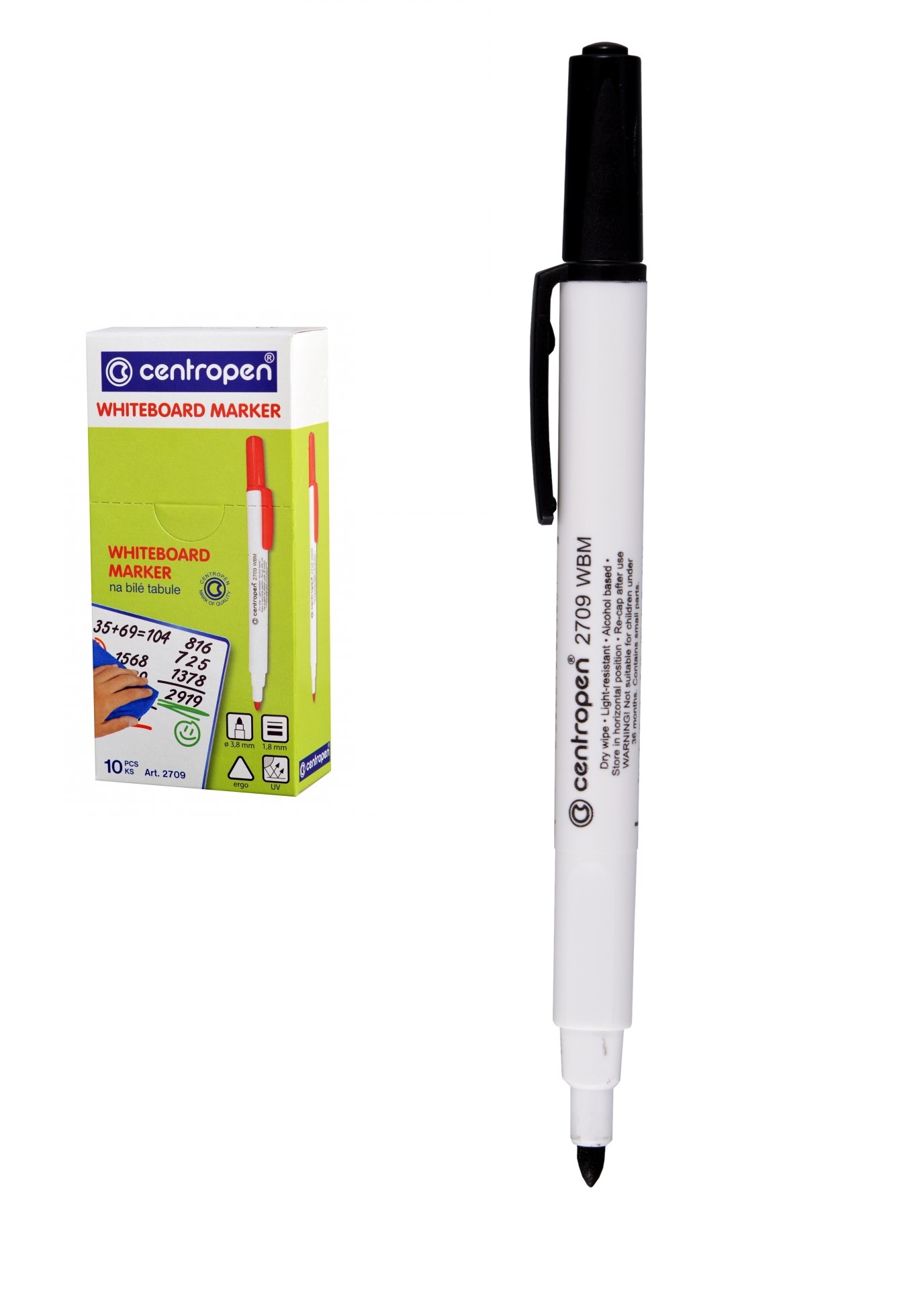 10/ stíratelný značkovač na bílé tabulky, ERGO držení, zdravotně nezávadný, za sucha stíratelný, světlostálý, alkoholová báze, skladovat ve vodorovné poloze, válcový hrot, šířka stopy 1,8 mm