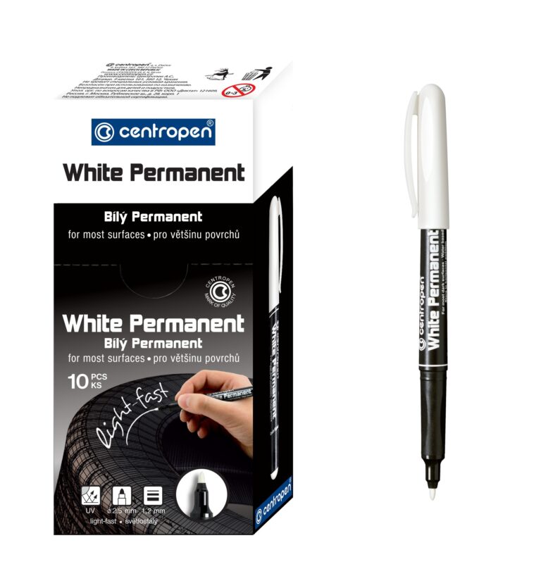 10/ univerzální bílý značkovač, píše na většinu povrchů, po zaschnutí odolá za sucha otěru, na porézních površích permanentní, světlostálý, vodní