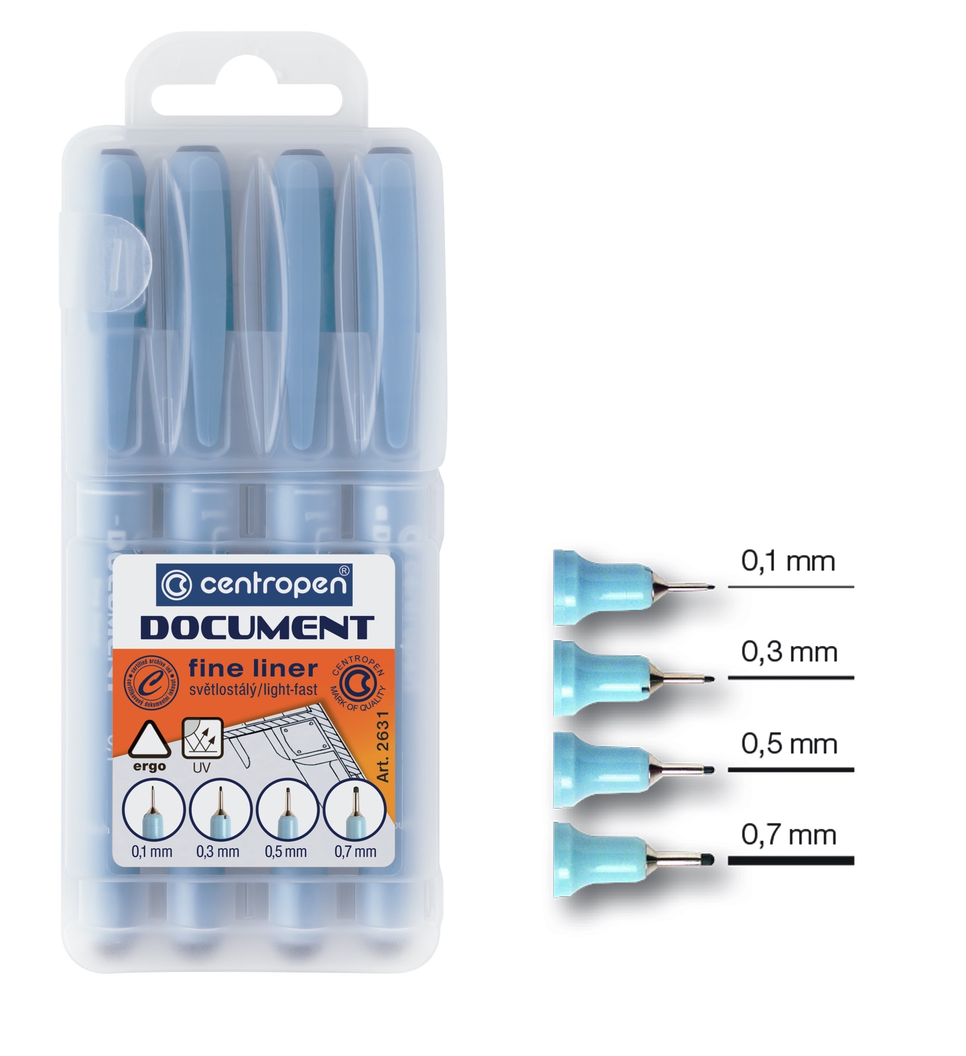 10/ dokumentní liner, ERGO držení, dokumentní, světlostálý, voděodolný inkoust, plastový hrot v kovové objímce, délka stopy 500 – 600 m, šířka stopy 0,1-0,3-0,5-0,7 mm