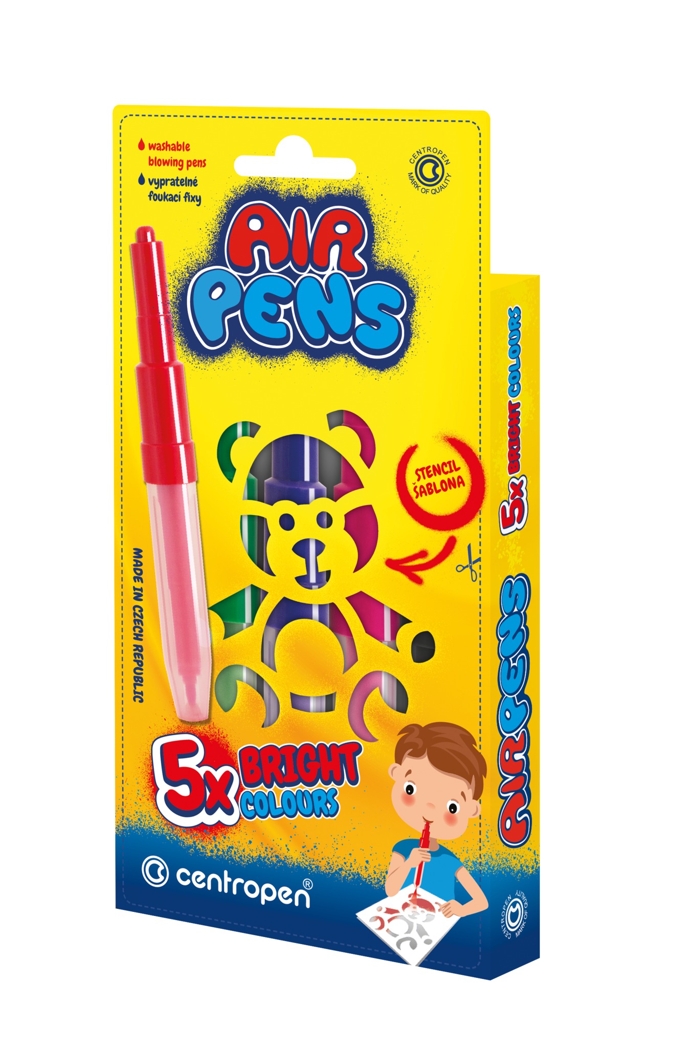 12/ foukací fixy na papír, zdravotně nezávadný inkoust, snadno smyvatelné a vypratelné, 5 barevných odstínů, 1 šablona