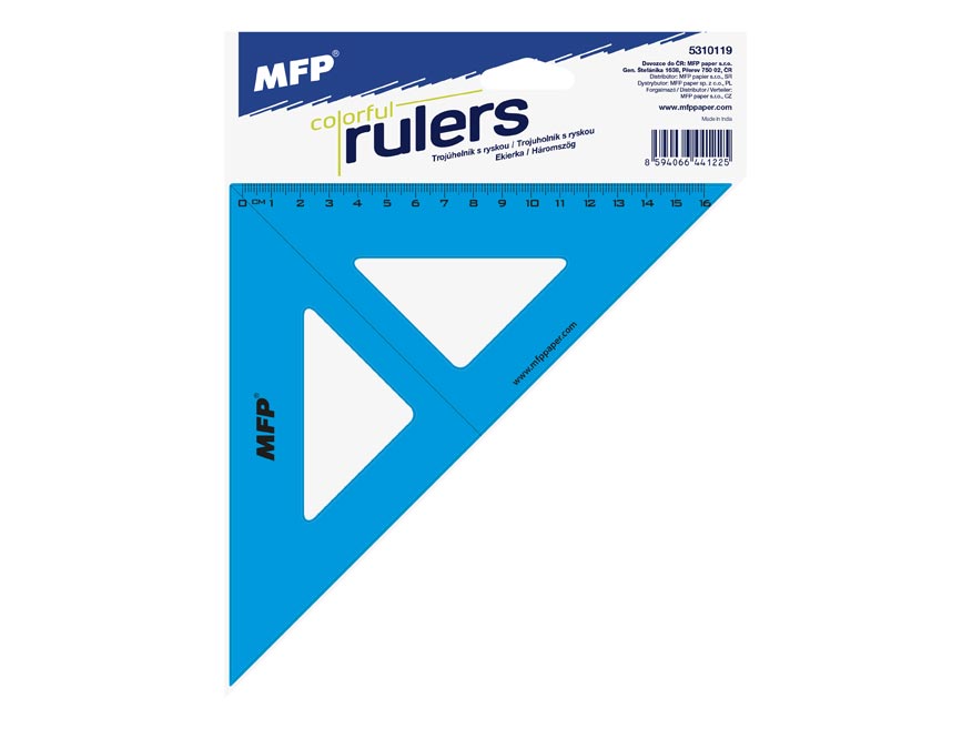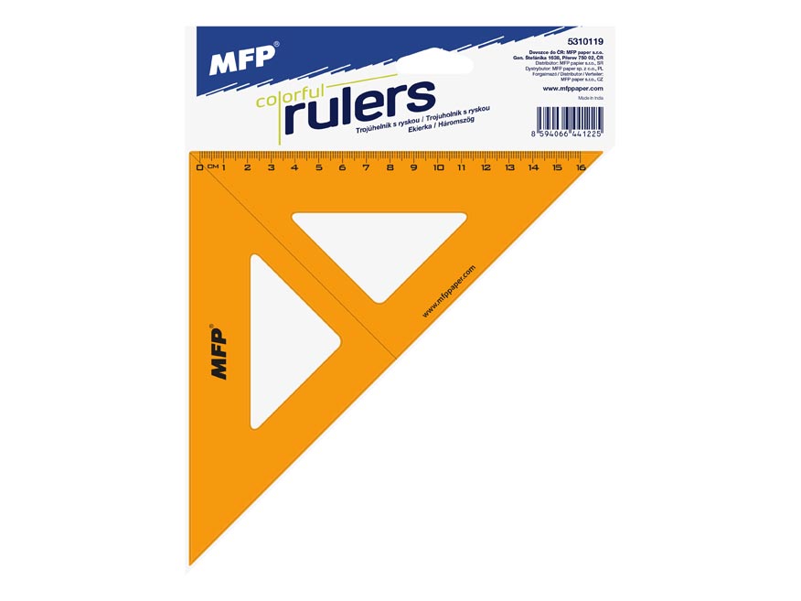 Školní, plastové pravítko pravoúhlý trojúhelník s ryskou o délce 16 cm – pomocník při geometrii. Pravítko svírá úhly 45°/90°/45°.