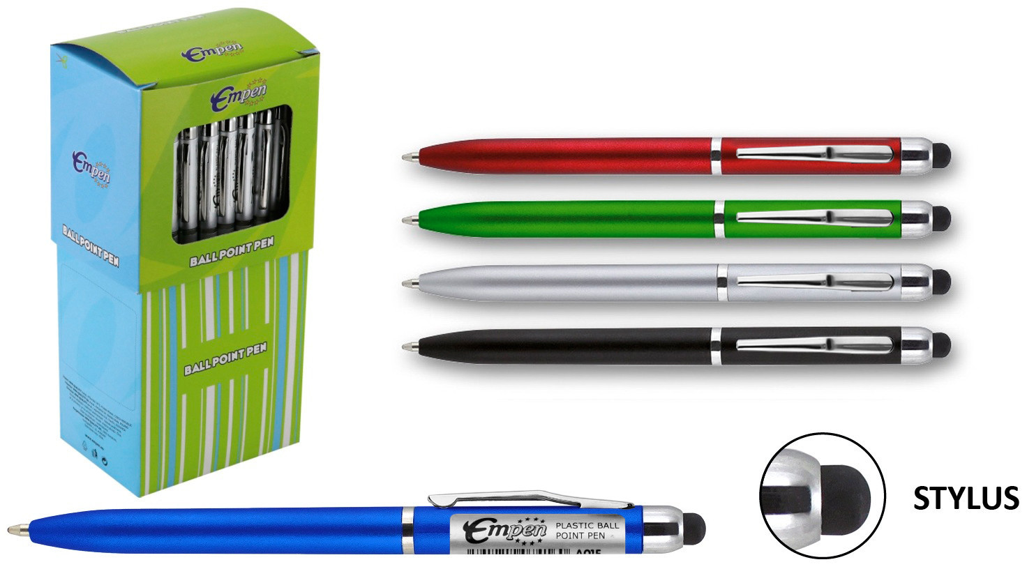 40/ plastové kuličkové pero s gumou pro ovládání dotykových displejů, délka propisky 11cm, délka náplně 8,3cm, v balení 40 ks, cena za kus, mix 5 barev