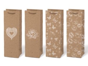 Přemýšlíte, jak elegantně a nápaditě zabalit láhev jako dárek? S dárkovou taškou T12 KRAFT to zvládnete snadno a s grácií. Tyto tašky jsou nejen praktické, ale také nádherně stylové. Vyrobené z kraftového papíru, spojují ekologický přístup s moderním designem. Jsou ideální pro standardní láhve vína, šampaňského, domací limonády nebo úzké lahve do výšky 36 cm. Darujte stylově – stačí jen vložit láhev! MOTIV: - srdce - leknín - vážky, motýli, včely - květy Barva: hnědá/přírodní Materiál: kraftový papír Rozměr: 125 x 365 x 90 mm Dodáváme v mixu 4 motivů dle skladové zásoby. Uvedená cena je za 1 ks.