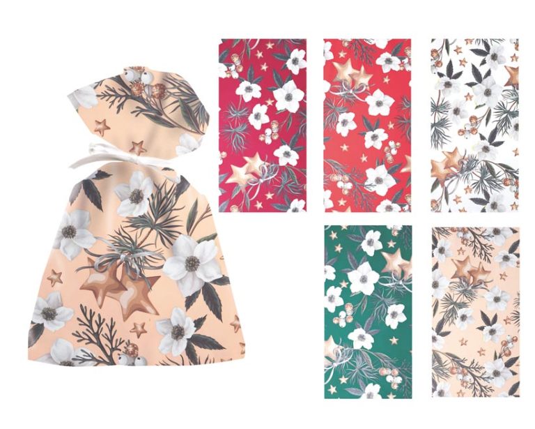 Vánoční dárkový sáček White Christmas vnese do každého dárku kouzlo sváteční pohody. Jemný motiv bílých květů, zelených větviček jehličí, hvězdiček a perníčků vytváří harmonickou kombinaci zimní elegance a tepla domova. Sáček působí luxusně, přitom zůstává vkusný a příjemně tradiční – přesně tak, jak si představujeme pravé Bílé Vánoce.