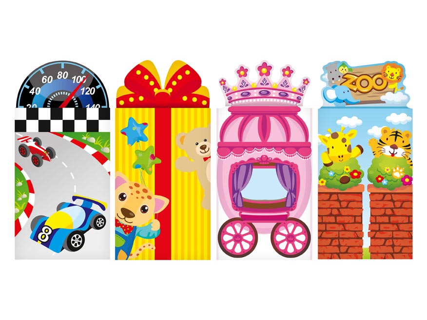 Titul obsahuje 4 barevná pozadí, 8 listů omalovánek a 4 listy statických samolepek, které