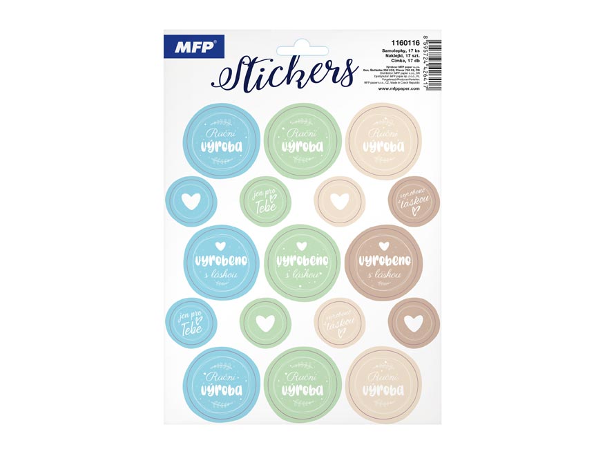 Stylové samolepky s nápisy jako „Ruční výroba“, „Vyrobeno s láskou“ nebo „Jen pro Tebe“ dodají každému balíčku osobní nádech. Pastelové tóny modré, zelené a béžové působí čistě a elegantně – skvěle ladí s přírodními i minimalistickými materiály.