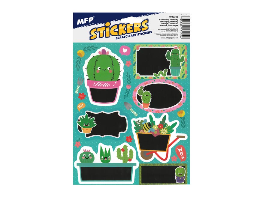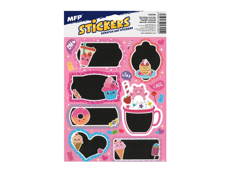 Škrabací samolepící jmenovky. Každá samolepka má jiný tvar a obrázek. Díky netradičnímu vzhledu samolepek dostane váš sešit, diář či blok originální look. Popisek bude po vyškrabání barevný.