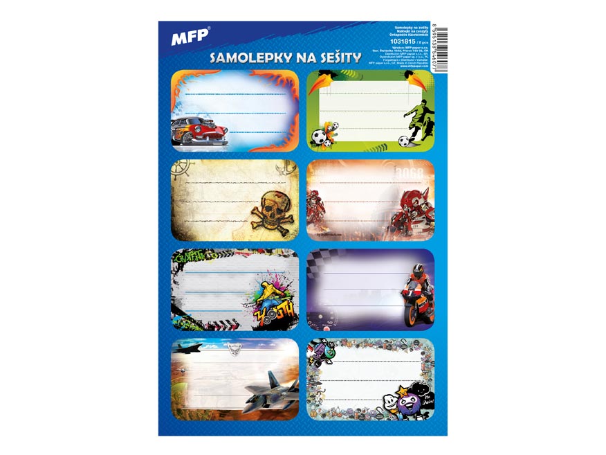 – 8 různých motivů samolepek k polepení sešitů a každá samolepka obsahuje 4 řádky, do kterých se vypíše jméno a příjmení, předmět, školní rok, třída žáka, název školy